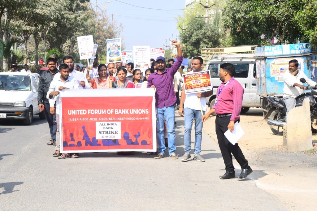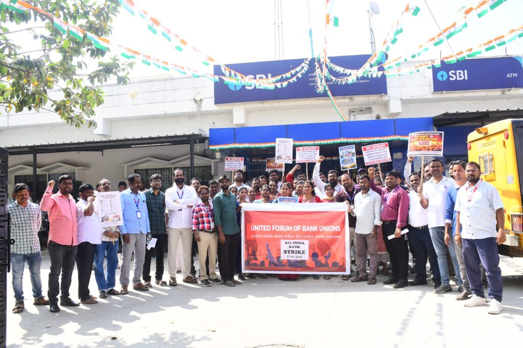 దేశవ్యాప్తంగా బ్యాంకు ఉద్యోగులు ఐదు రోజుల పని విధానం అమలు చేయాలంటూ జాతీయ సమ్మెకు పిలుపునిచ్చారు. యునైటెడ్ ఫోరం ఆఫ్ బ్యాంక్ యూనియన్స్ (UFBU) పిలుపు మేరకు ఈ సమ్మె నిర్వహించగా, నాగర్కర్నూల్ జిల్లాలో కూడా బ్యాంకు ఉద్యోగులు పెద్ద సంఖ్యలో పాల్గొన్నారు.నాగర్కర్నూల్లో స్టేట్ బ్యాంక్ ఆఫ్ ఇండియా (SBI) ఆధ్వర్యంలో బ్యాంకు ఉద్యోగులు నిరసన చేపట్టారు. బ్యాంకు ఉద్యోగులకు కూడా ఇతర ఆర్థిక సంస్థల మాదిరిగా వారానికి ఐదు రోజుల పని విధానం అమలు చేయాలని డిమాండ్ చేశారు. ఈ విధానం ద్వారా పని – వ్యక్తిగత జీవన సమతుల్యత సాధ్యమవుతుందని ఉద్యోగ సంఘాల నాయకులు పేర్కొన్నారు.ఉద్యోగుల సంక్షేమంతో పాటు ప్రజలకు మరింత మెరుగైన సేవలు అందించేందుకు ఈ డిమాండ్ కీలకమని UFBU నేతలు స్పష్టం చేశారు. కేంద్ర ప్రభుత్వం వెంటనే బ్యాంకు ఉద్యోగుల న్యాయమైన డిమాండ్లను పరిష్కరించాలని ఈ సందర్భంగా విజ్ఞప్తి చేశారు.ఈ సమ్మెలో నాగర్కర్నూల్ జిల్లా పరిధిలోని SBI శాఖల ఉద్యోగులు, అధికారులు పూర్తిస్థాయిలో పాల్గొనడంతో సాధారణ బ్యాంకింగ్ లావాదేవీలు నిలిచిపోయాయి. ఈ సమ్మెకు యూనియన్ బ్యాంక్ ఆఫ్ ఇండియా, తెలంగాణ గ్రామీణ బ్యాంకు (TGB) ఉద్యోగులు కూడా మద్దతు తెలిపారు.ఈ కార్యక్రమంలో UFBU ప్రతినిధులు శ్రీకాంత్ రెడ్డి, శ్రీనివాసులు, రాజేశ్ చారి, లక్ష్మణ్ తదితరులు పాల్గొని బ్యాంకు ఉద్యోగుల డిమాండ్లపై ప్రసంగించారు.