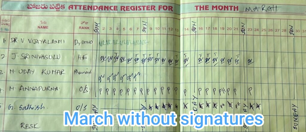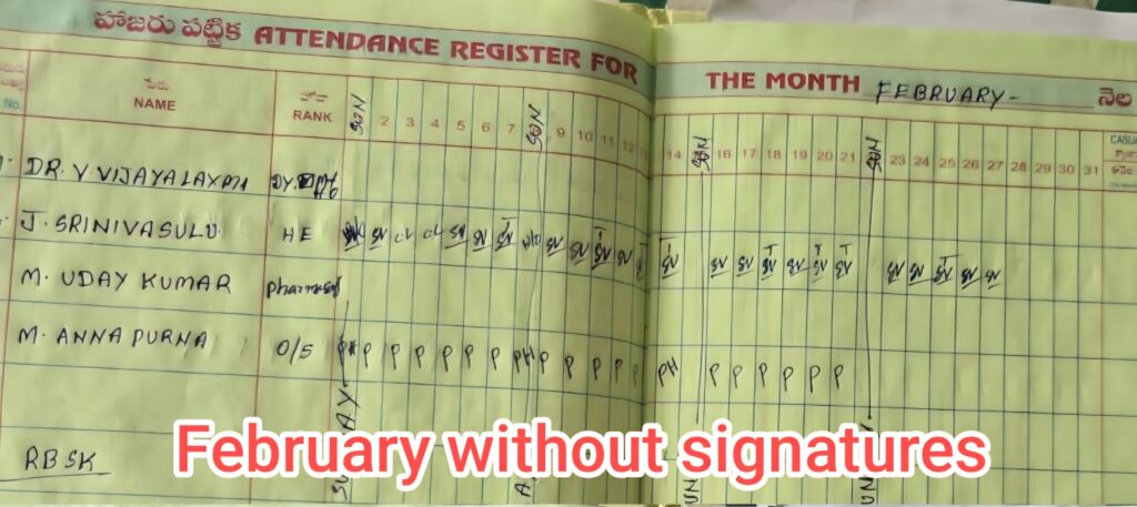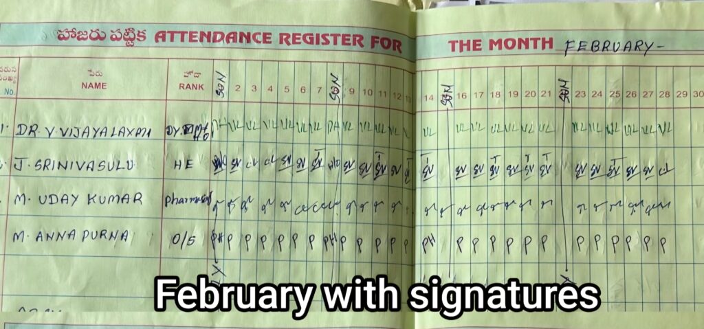 నెలల తరబడి విధులకు హాజరుకాకుండా, డ్యూటీ రిజిస్టర్లో సంతకాలు చేయకుండా ఖాళీగా వదిలేసినట్లు ఆధారాలు బయటపడ్డాయి. అయితే, ఉన్నతాధికారుల తనిఖీ భయంతోనో లేక అక్రమంగా జీతం డ్రా చేయడానికో గానీ, ఇటీవలే ఆమె ఆ ఖాళీ రిజిస్టర్లో ఒకే రోజు నెలల తరబడి సంతకాలు పూర్తి చేసినట్లు తెలుస్తోంది. దీనిని బట్టి ఆమె విధులకు రావడం లేదని, కేవలం పేపర్ల మీద మాత్రమే డ్యూటీ చేస్తున్నారని స్పష్టమవుతోంది. కొన్ని సందర్భాల్లో కింది స్థాయి ఉద్యోగులతో కూడా సంతకాలు చేయిస్తున్నారనే విమర్శలు వినిపిస్తున్నాయి.